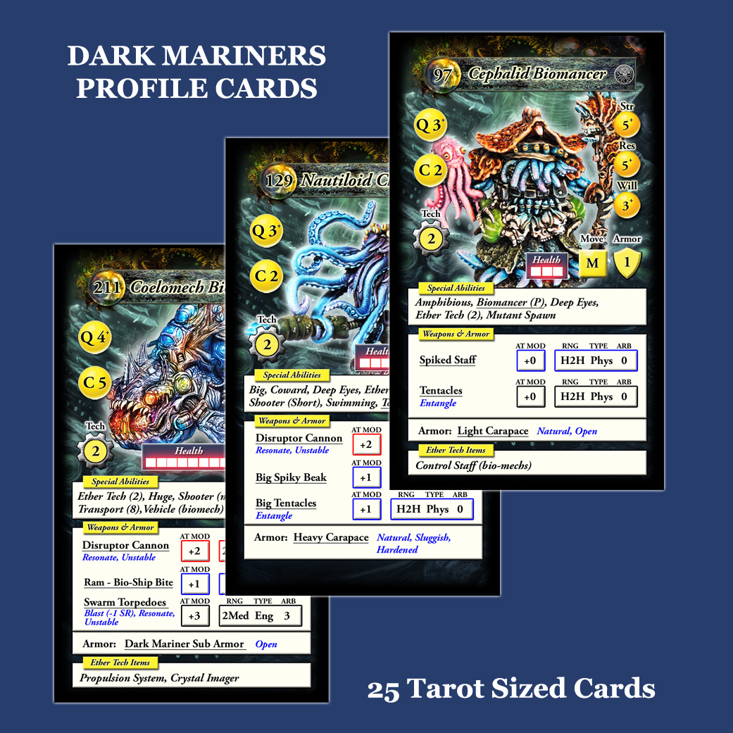 This set of profile cards includes 25 cards from the Dark Mariners. The cards are Tarot sized and on premium cardstock, ready to play in DeepWars 3.0.